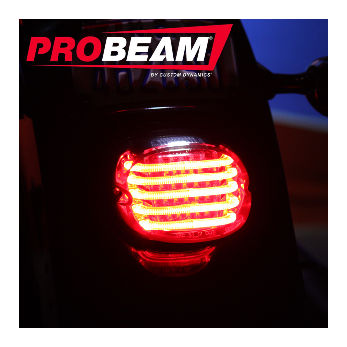 ProBEAM® LED Taillights have been engineered with the highest quality automotive LEDs and modern light pipe design! Custom Dynamics® premium line of aftermarket LED motorcycle taillights provides increased side visibility to maximize safety for Harley-Davidson® motorcycles. 5 light pipes illuminate across the taillight as the constant on running light, while 25 separate LEDs provide a full contrast brake light. All options are DOT/SAE Compliant. Red lens option with No Window or Top Window is ECE Compliant. Smoked lens option with Top Window is ECE Compliant.
