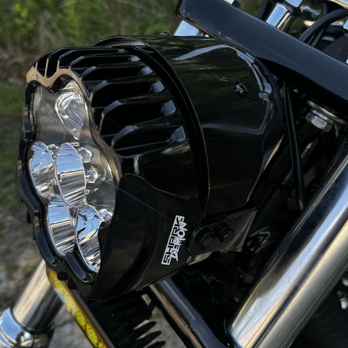 Shark Demon™ LED Headlight offers high-performance illumination, specialized for motorcycle on road use. DOT & SAE compliant design with unmatched beam pattern and durability. Low beam projects 3600 raw/2651 effective lumens from three projection-style LEDs. High beam adds four additional direct-reflective LEDs boasting an impressive 9080 raw/4485 effective lumens total. Single lamp assembly is completely sealed IP67, waterproof with clear polycarbonate lens and gloss black aluminum housing. 3mm, 304 gloss black stainless steel mounting bracket and aluminium visor. Included plug and play universal wire harness provides connection points to OEM wiring on 12 VDC systems with 3/4" headlight mounting block.